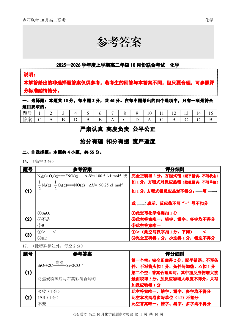 高二化学答案--辽宁省点石联考2025-2026学年高二上学期10月月考