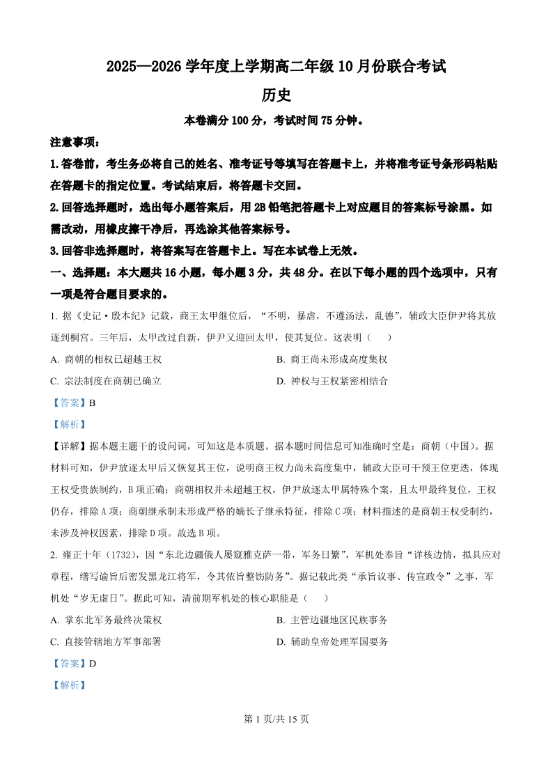 高二历史(精品解析版)--高二化学--辽宁省点石联考2025-2026学年高二上学期10月月考
