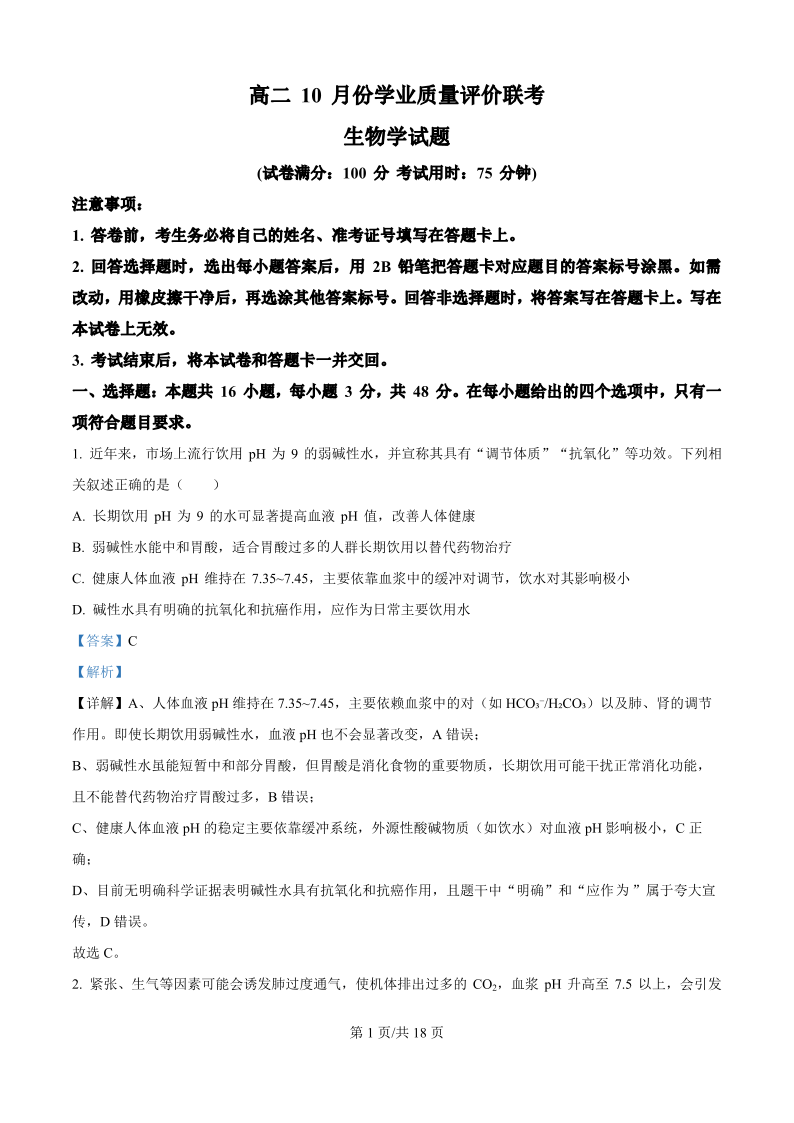 高二生物(精品解析版)--山西省2025-2026学年高二T8联考10月份学业质量评价联考