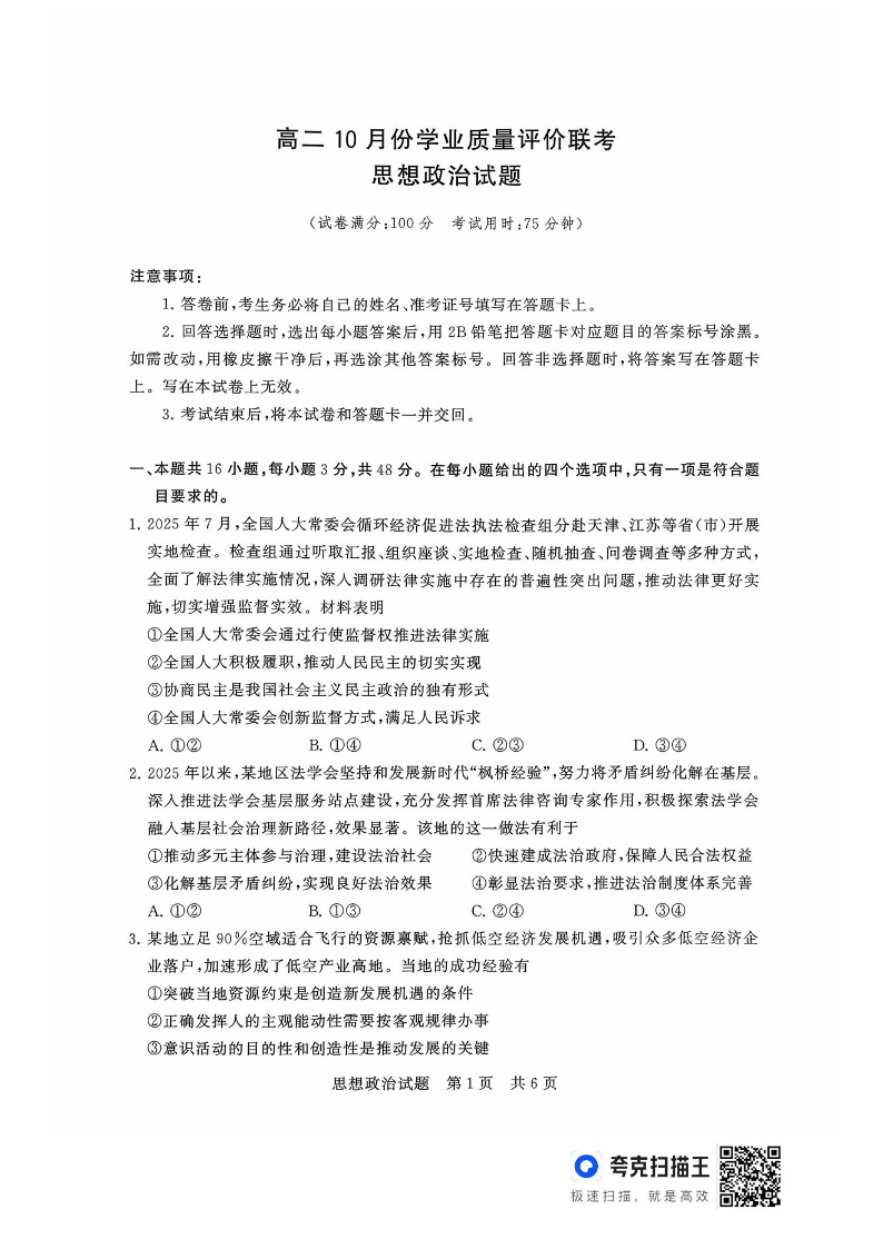 高二政治+答案--山西省2025-2026学年高二T8联考10月份学业质量评价联考