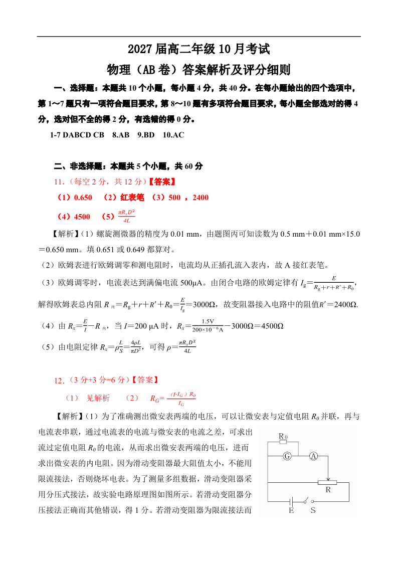 高二物理AB卷答案--湖北省云学联盟2025-2026学年高二上学期10月月考