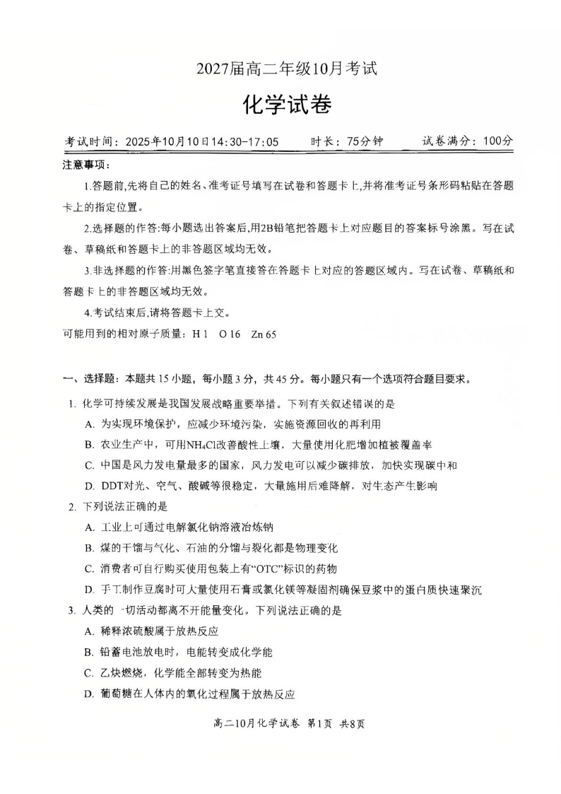 高二化学--湖北省云学联盟2025-2026学年高二上学期10月月考
