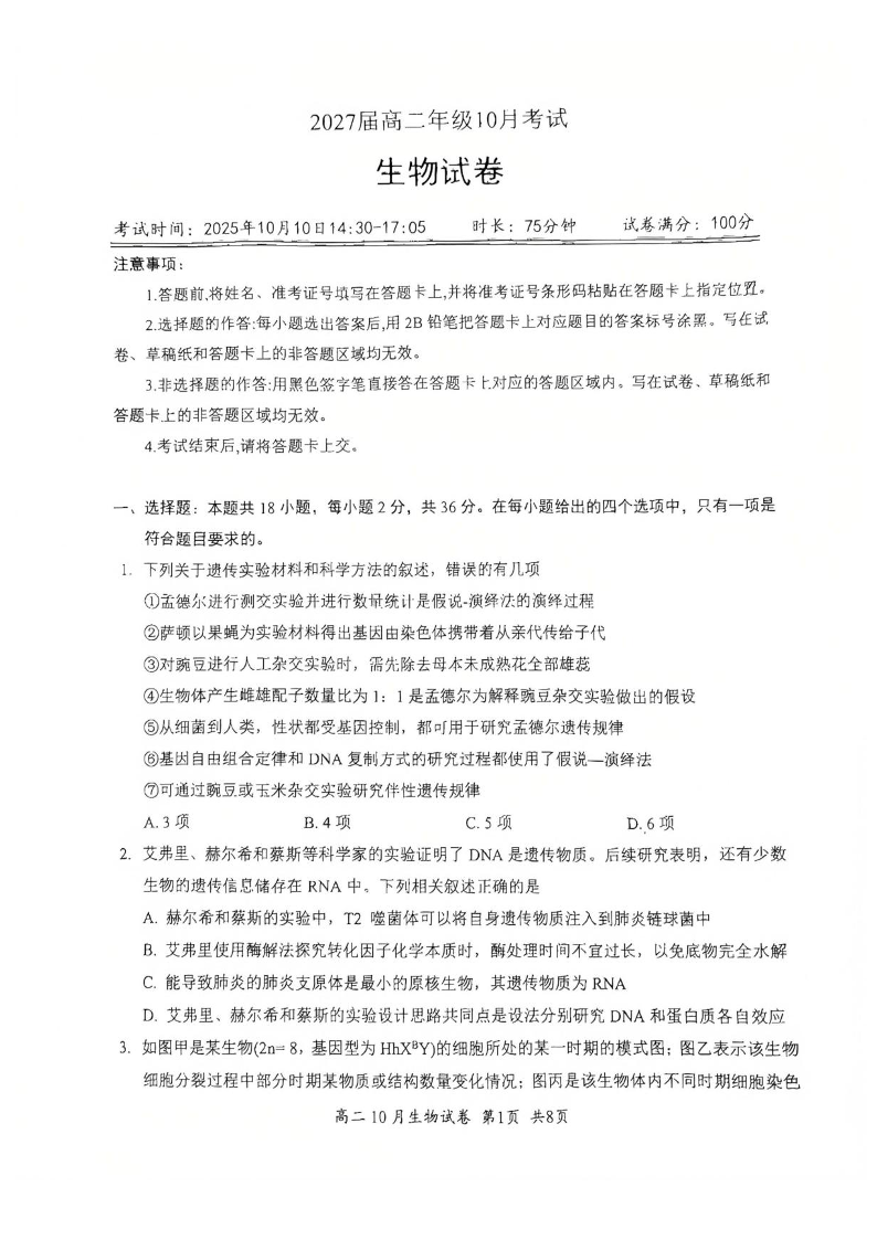 高二生物+答案--湖北省云学联盟2025-2026学年高二上学期10月月考