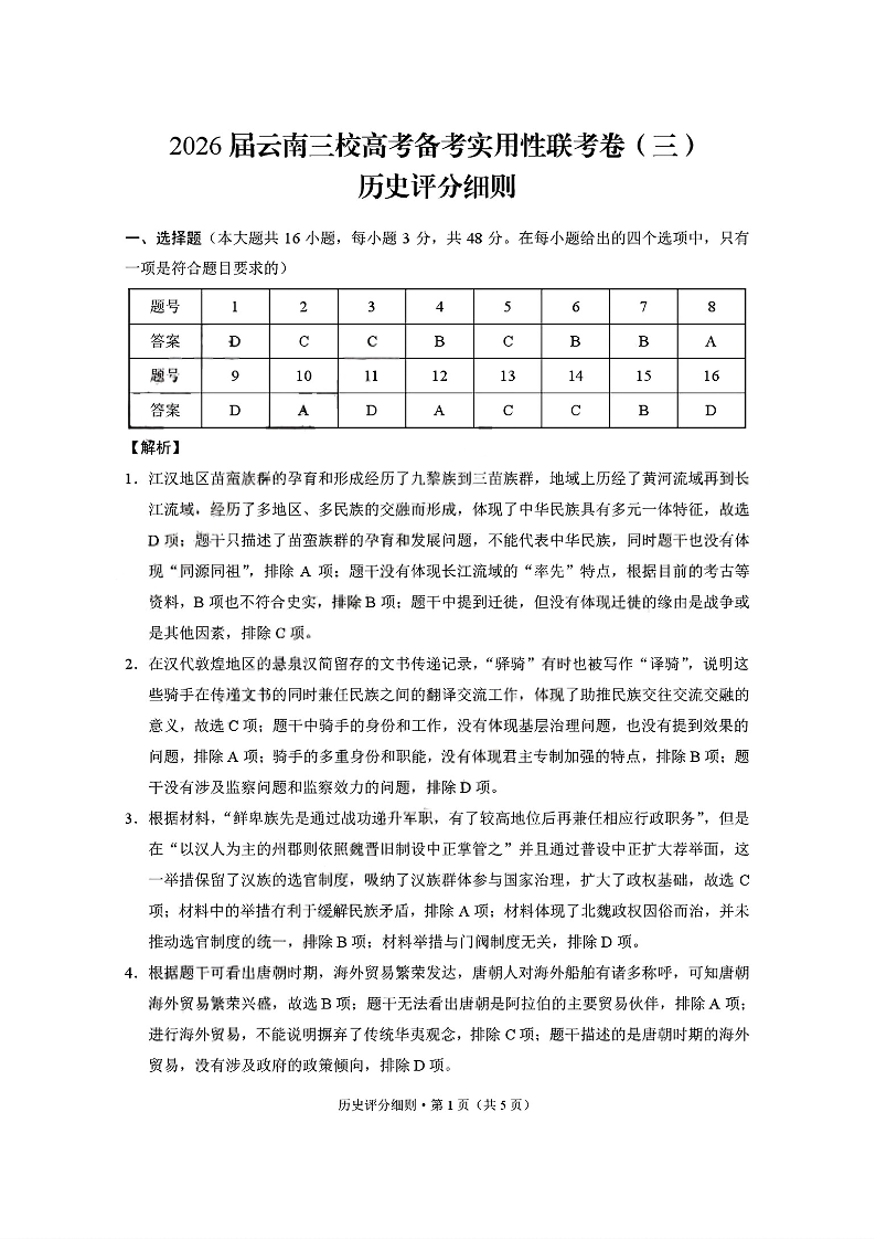 高三历史答案--云南省三校2026届高考备考实用性联考卷(三)