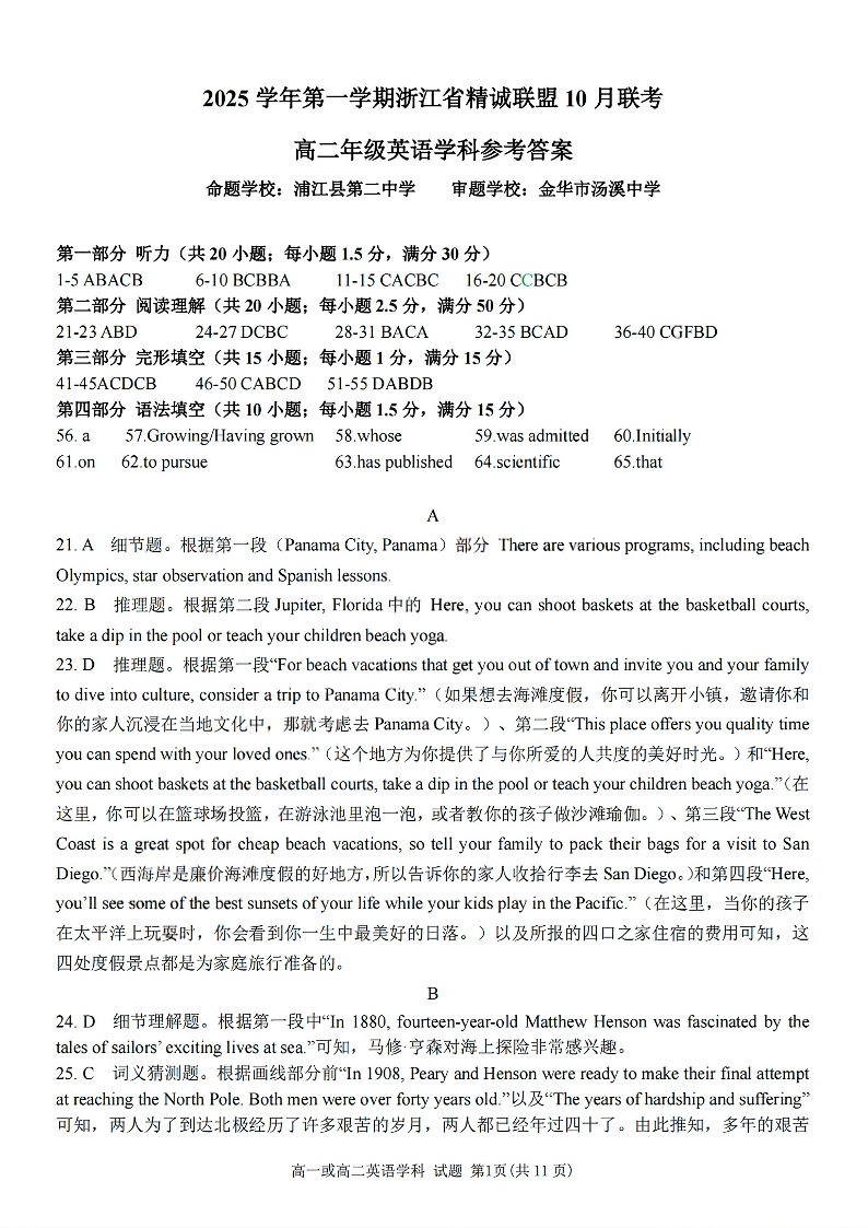 高二英语答案--浙江精诚联盟2025-2026学年高二上学期10月联考