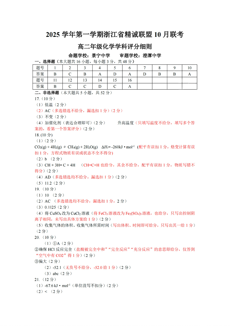 高二化学答案--浙江精诚联盟2025-2026学年高二上学期10月联考