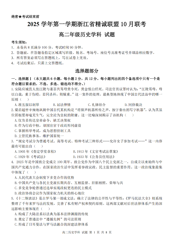 高二历史--浙江精诚联盟2025-2026学年高二上学期10月联考