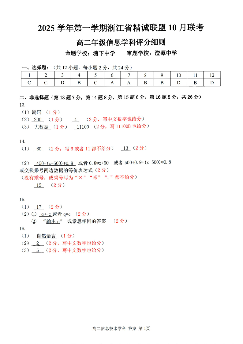 高二技术答案--浙江精诚联盟2025-2026学年高二上学期10月联考