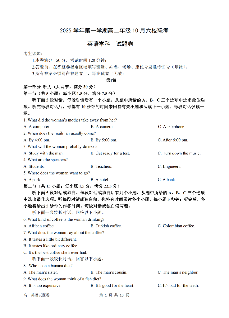 高二英语--浙江省六校联盟2025-2026学年高二上学期10月月考
