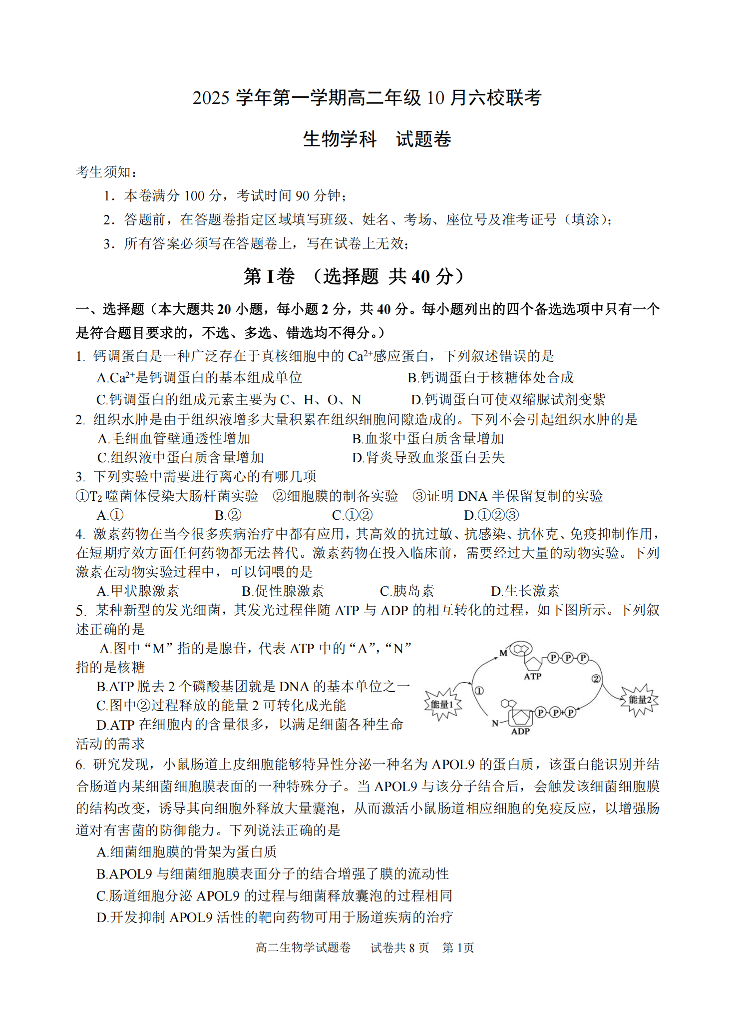 高二生物--浙江省六校联盟2025-2026学年高二上学期10月月考