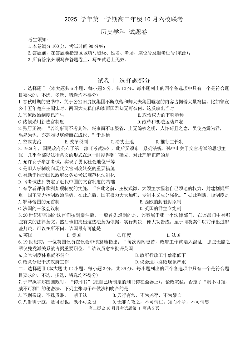 高二历史--浙江省六校联盟2025-2026学年高二上学期10月月考