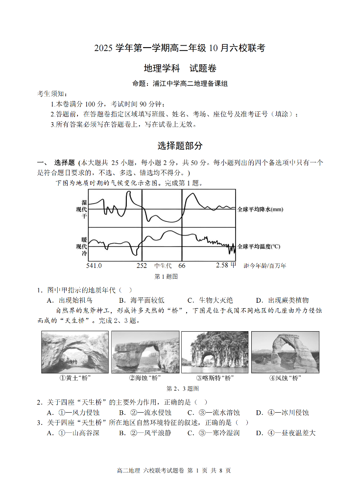 高二地理--浙江省六校联盟2025-2026学年高二上学期10月月考
