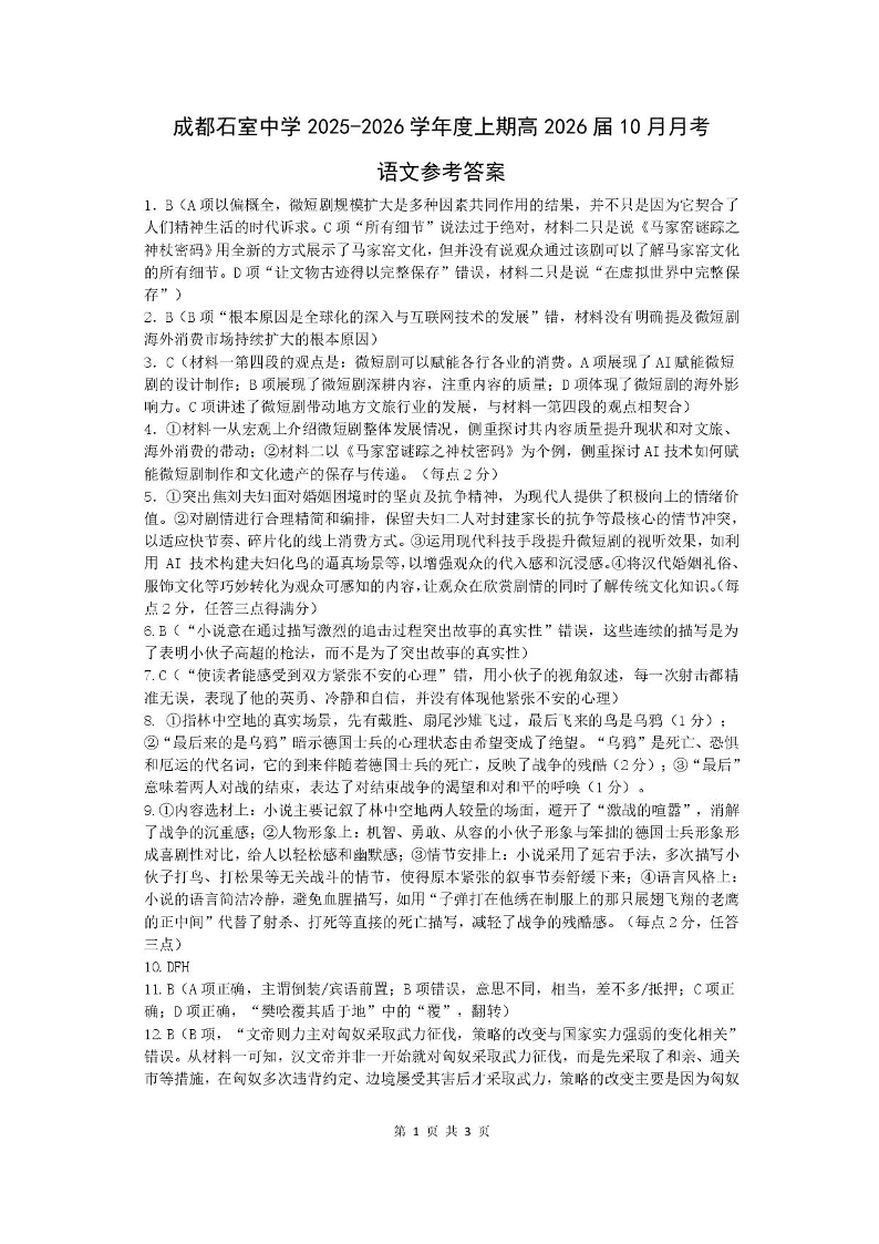 高三语文答案--四川省成都市石室中学2026届高三上学期10月月考