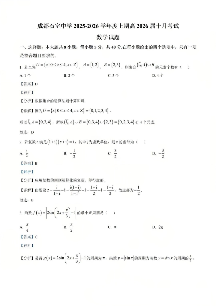 高三数学答案--四川省成都市石室中学2026届高三上学期10月月考