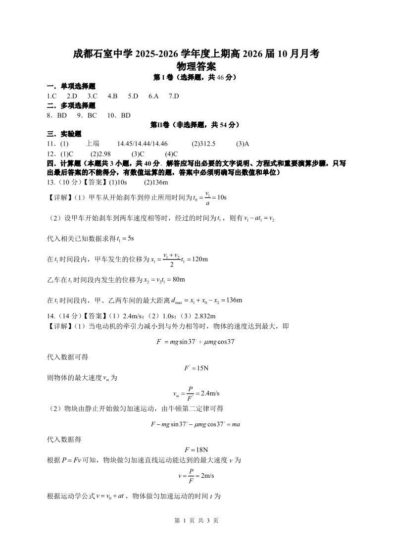 高三物理答案--四川省成都市石室中学2026届高三上学期10月月考