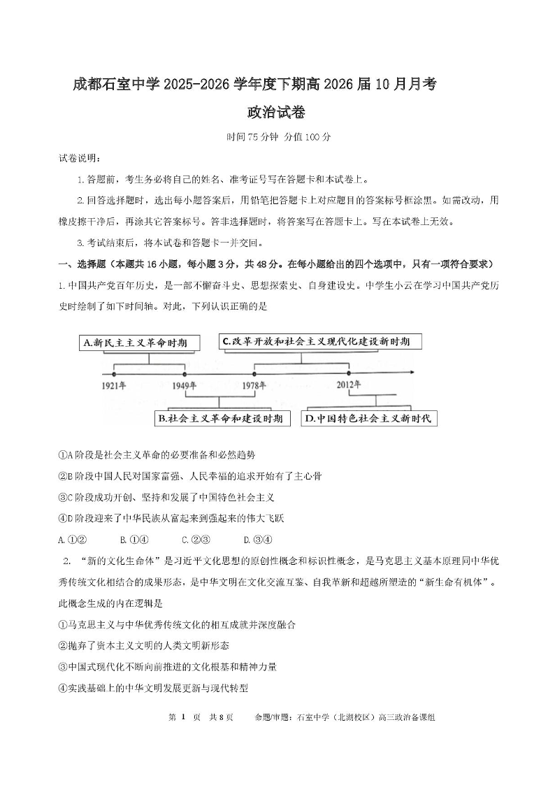 高三政治--四川省成都市石室中学2026届高三上学期10月月考