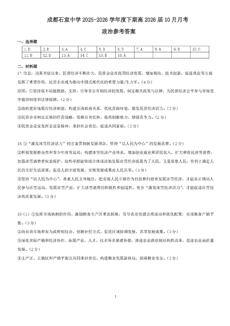 高三政治答案--四川省成都市石室中学2026届高三上学期10月月考