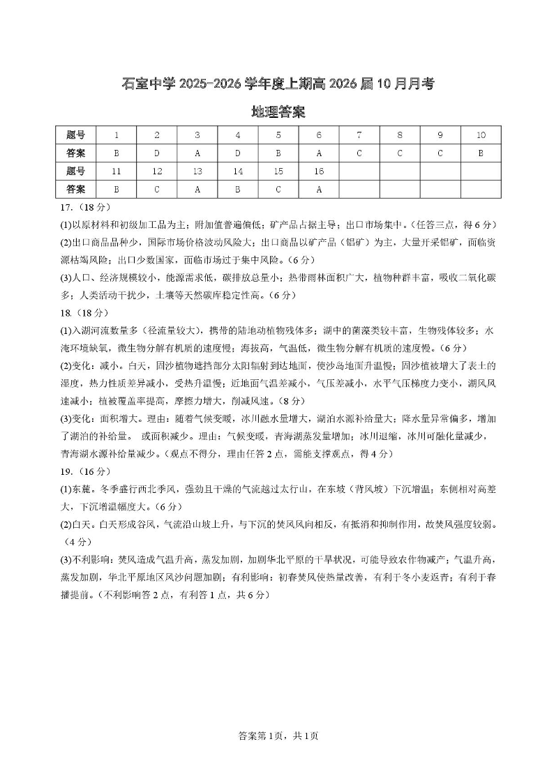 高三地理答案--四川省成都市石室中学2026届高三上学期10月月考
