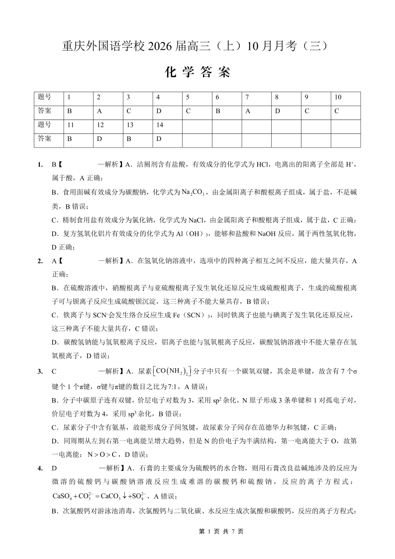 高三化学答案--重庆市外国语学校2026届10月月考(三)