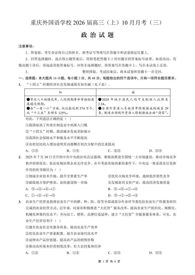 高三政治--重庆市外国语学校2026届10月月考(三)
