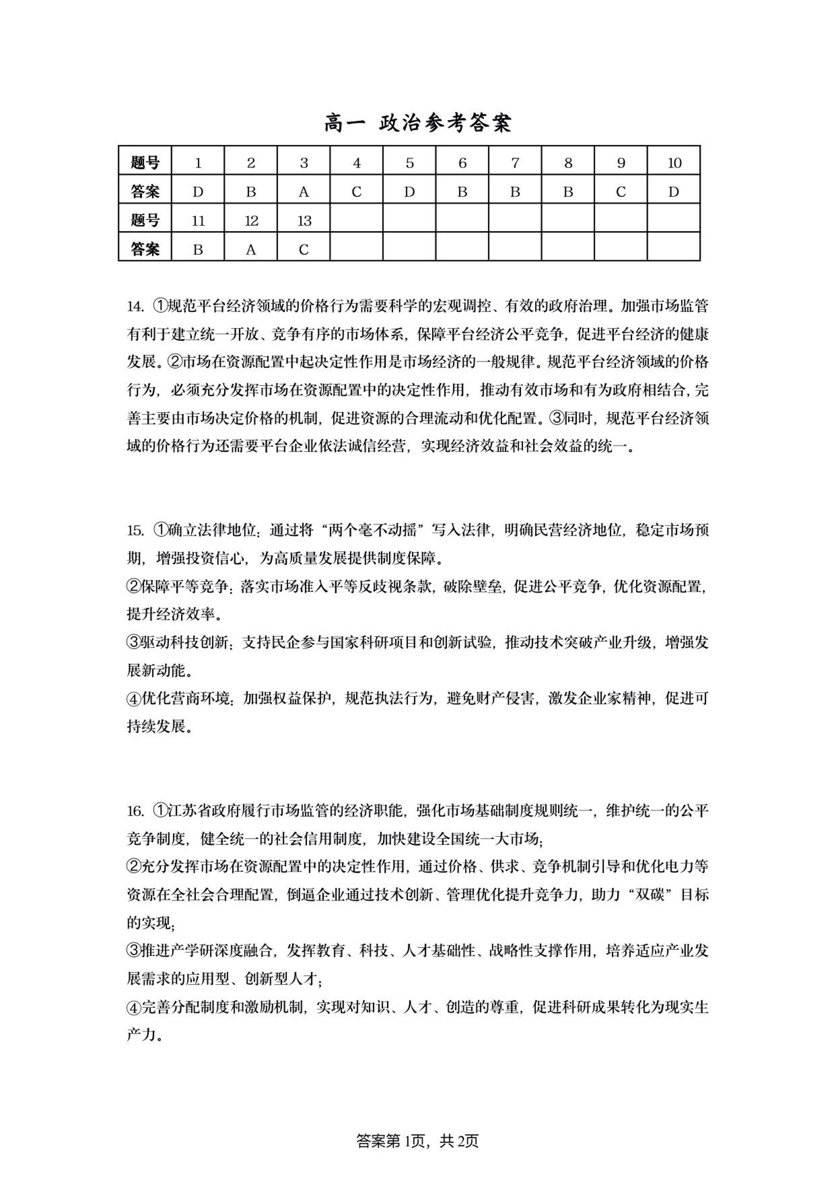高一政治答案--江苏省连云港市赣榆区新海高级中学2025-2026学年高一上学期10月学业水平质量监测