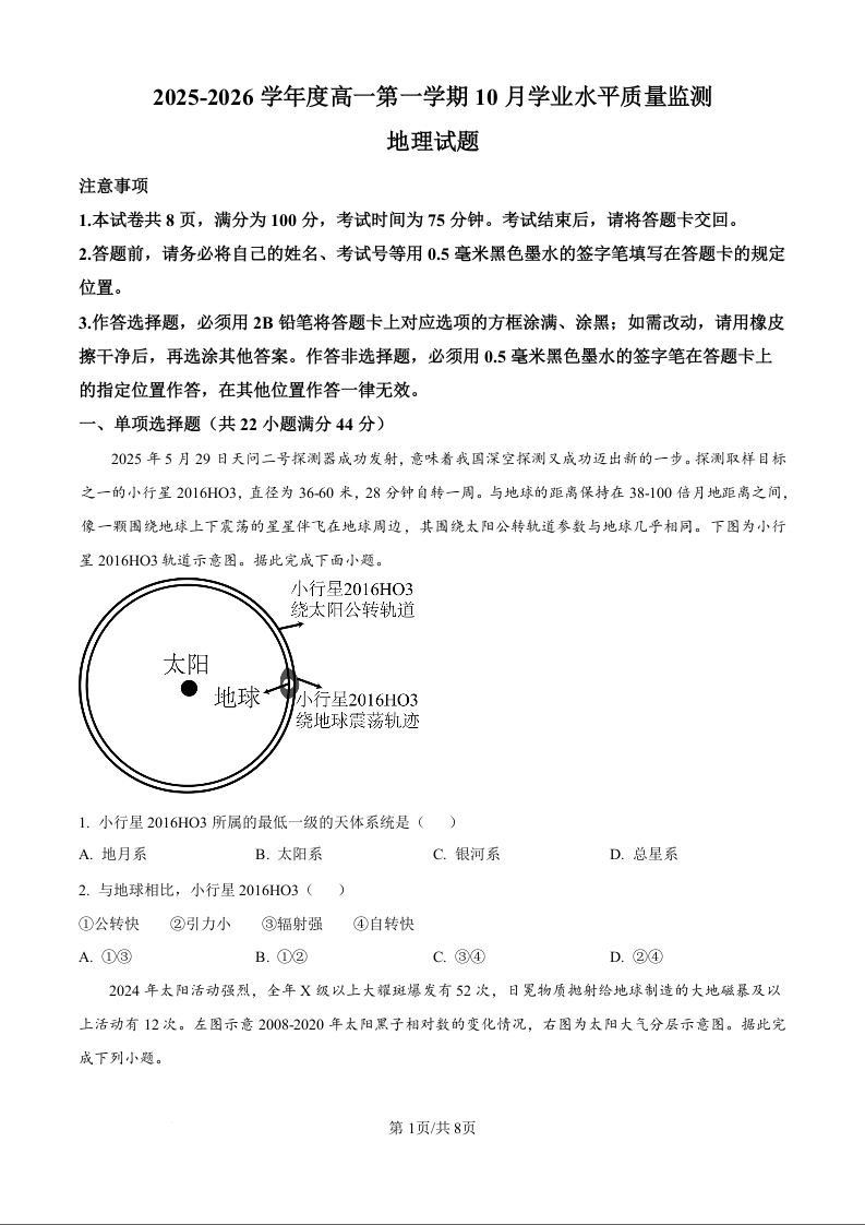 高一地理(原卷版)--江苏省连云港市赣榆区新海高级中学2025-2026学年高一上学期10月学业水平质量监测