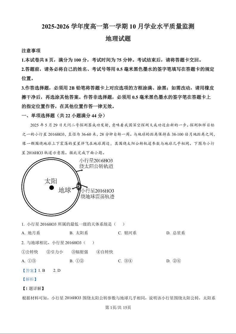 高一地理(精品解析版)--江苏省连云港市赣榆区新海高级中学2025-2026学年高一上学期10月学业水平质量监测