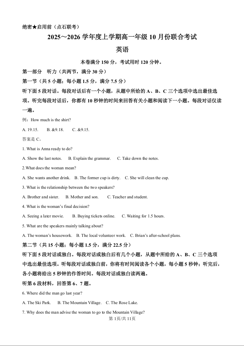 高一英语(原卷版)--辽宁省点石联考2025-2026学年高一上学期10月联考