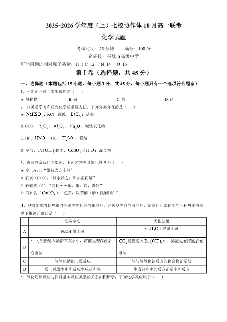 高一化学+答案--辽宁省七校协作体2025-2026学年高一上学期10月联考