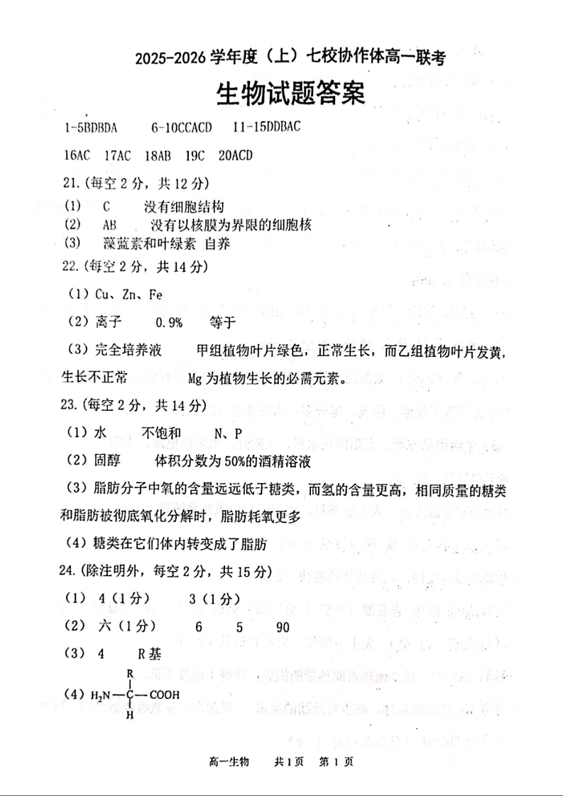 高一生物答案--辽宁省七校协作体2025-2026学年高一上学期10月联考