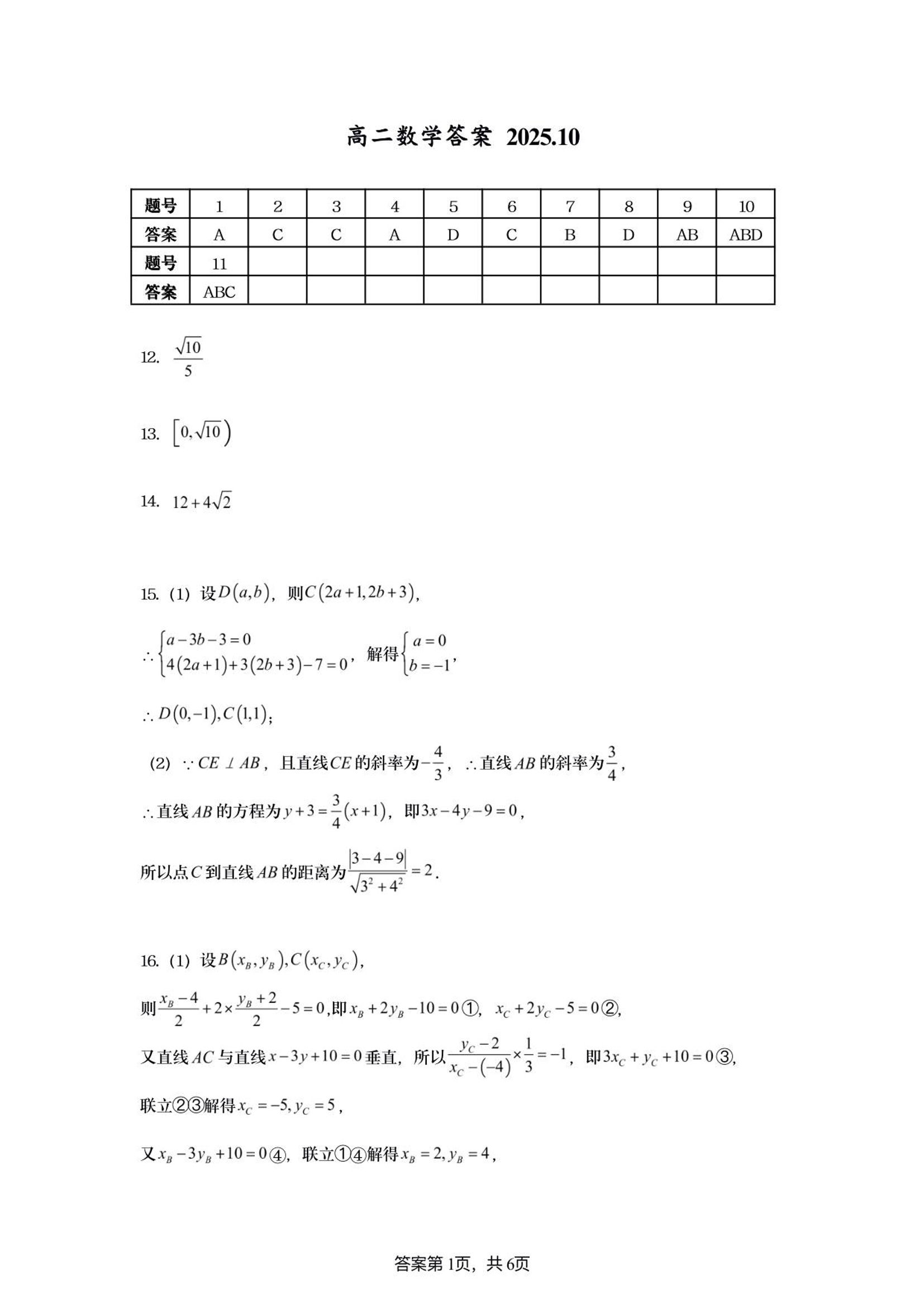 高二数学答案--江苏省连云港市赣榆区新海高级中学2025-2026学年高二上学期10月学业水平质量监测