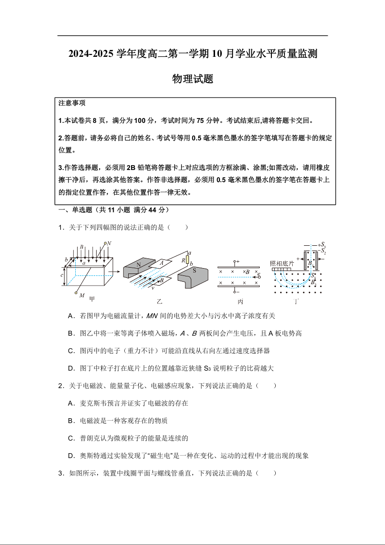 高二物理--江苏省连云港市赣榆区新海高级中学2025-2026学年高二上学期10月学业水平质量监测