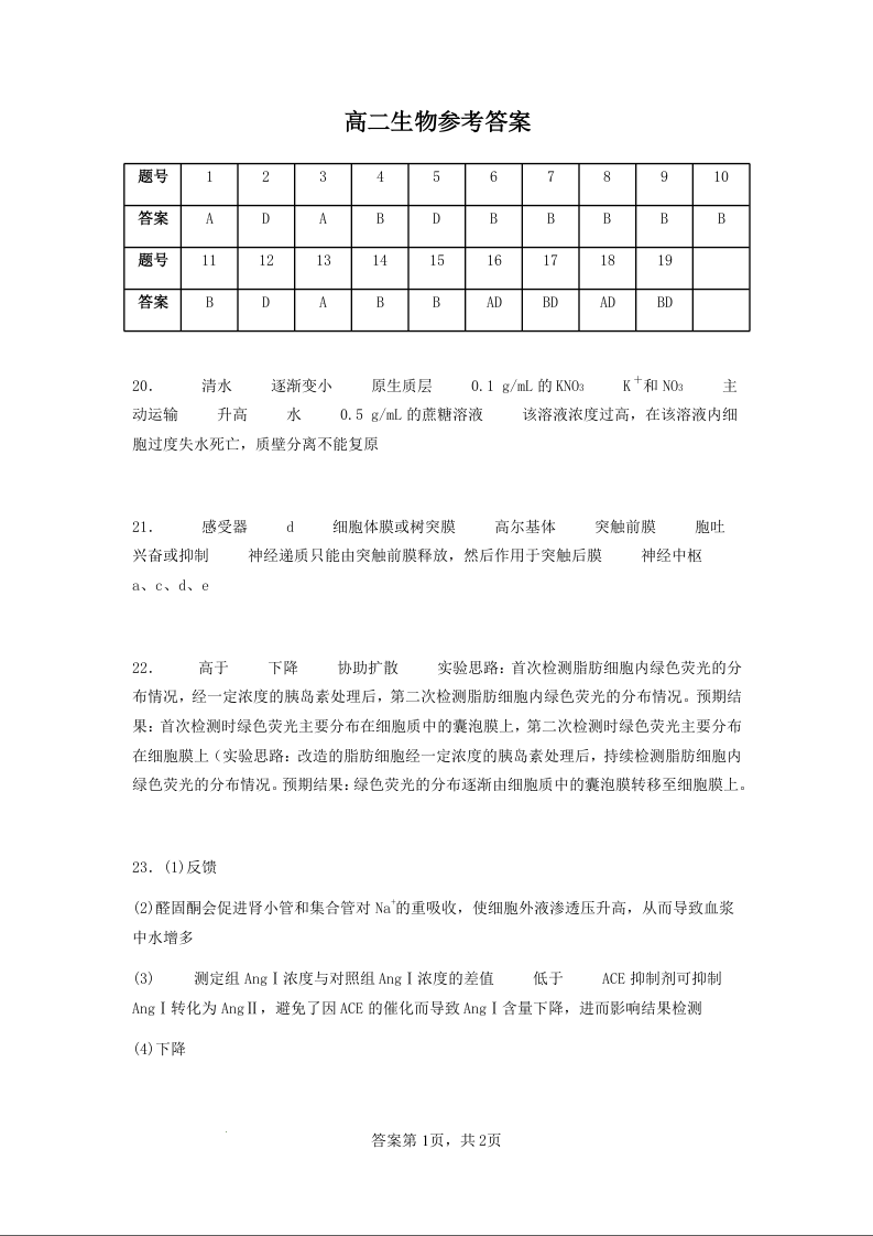 高二生物答案--江苏省连云港市赣榆区新海高级中学2025-2026学年高二上学期10月学业水平质量监测