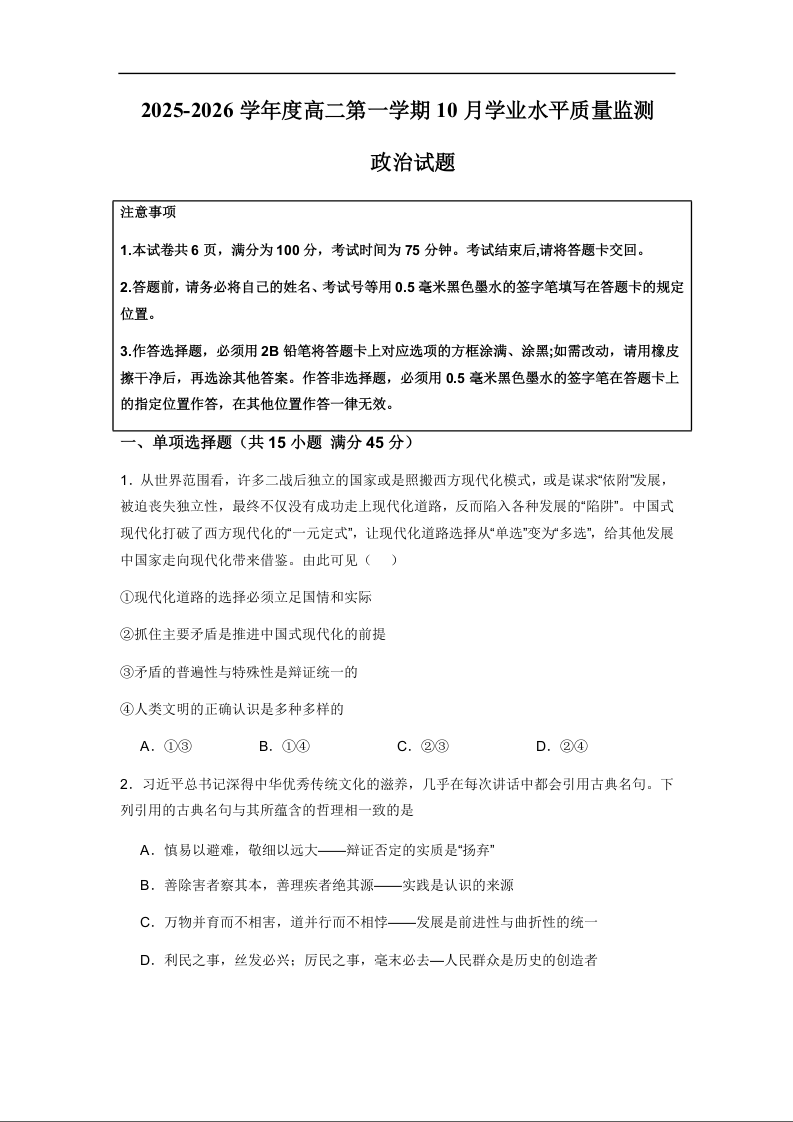 高二政治--江苏省连云港市赣榆区新海高级中学2025-2026学年高二上学期10月学业水平质量监测