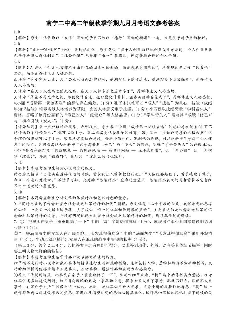 高二语文答案--广西南宁二中2025-2026学年上学期高二9月月考