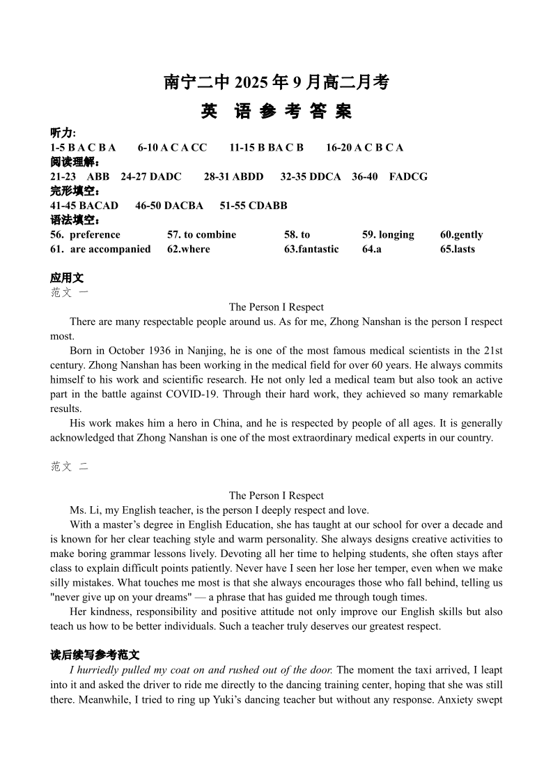 高二英语答案--广西南宁二中2025-2026学年上学期高二9月月考
