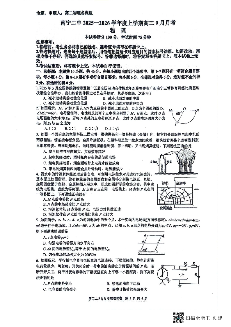 高二物理--广西南宁二中2025-2026学年上学期高二9月月考