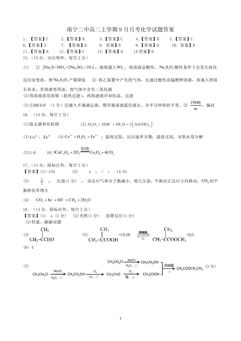 高二化学答案--广西南宁二中2025-2026学年上学期高二9月月考