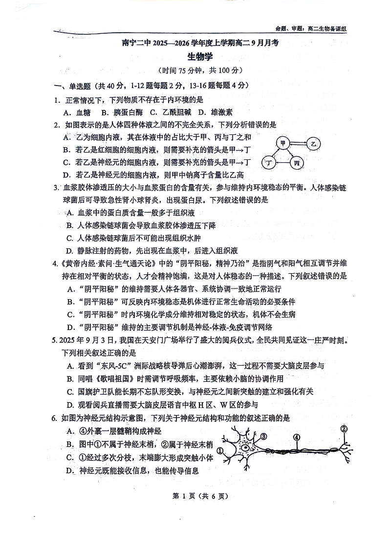 高二生物--广西南宁二中2025-2026学年上学期高二9月月考