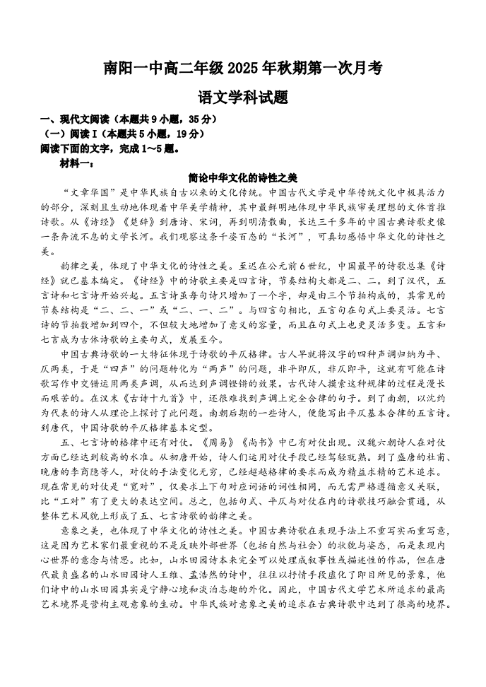 高二语文--河南省南阳市第一中学校2025-2026学年高二上学期第一次月考