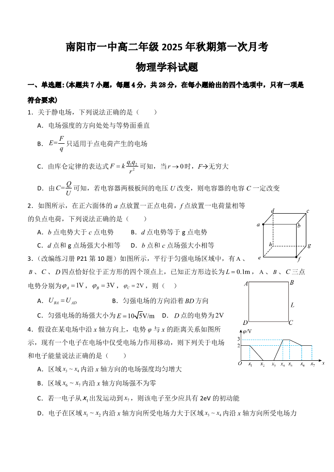 高二物理--河南省南阳市第一中学校2025-2026学年高二上学期第一次月考
