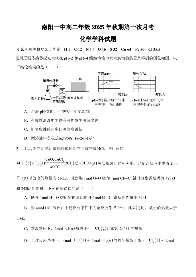高二化学--河南省南阳市第一中学校2025-2026学年高二上学期第一次月考