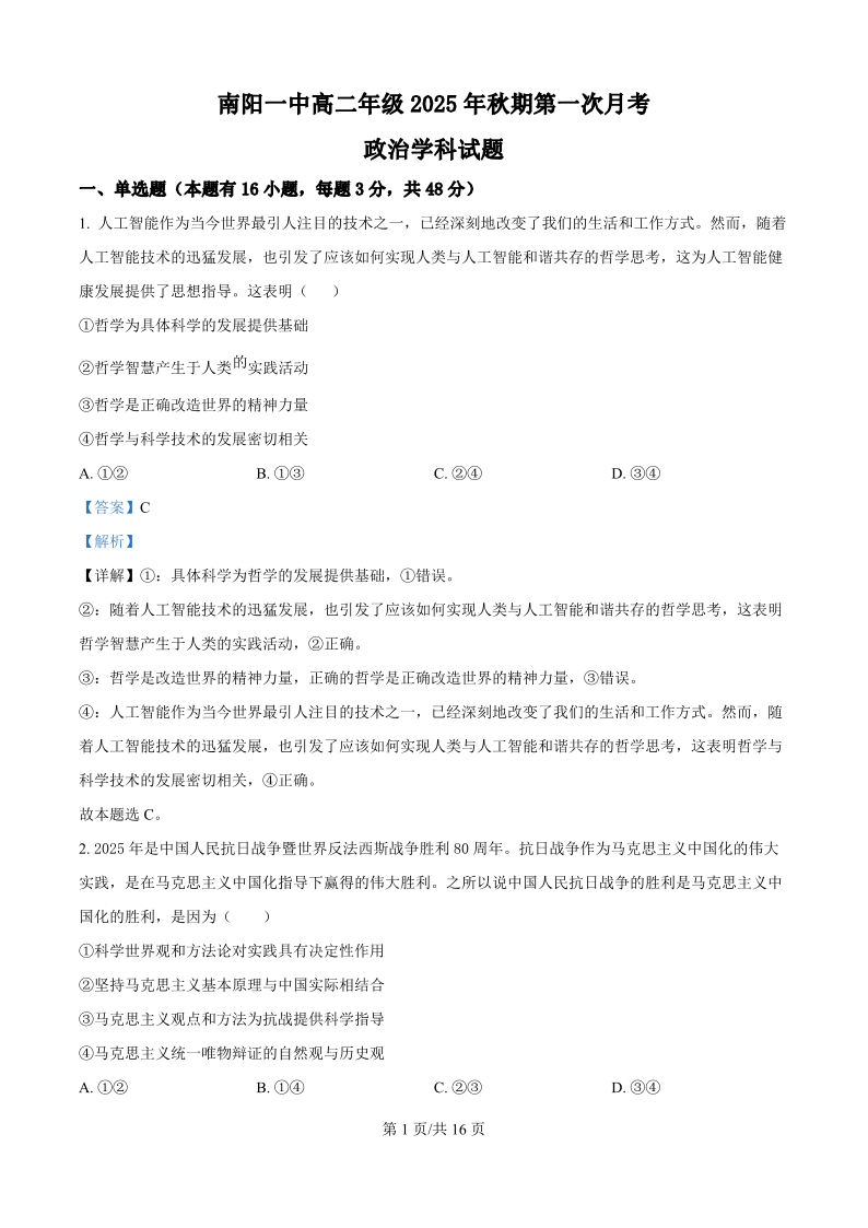 高二政治(精品解析版)--河南省南阳市第一中学校2025-2026学年高二上学期第一次月考