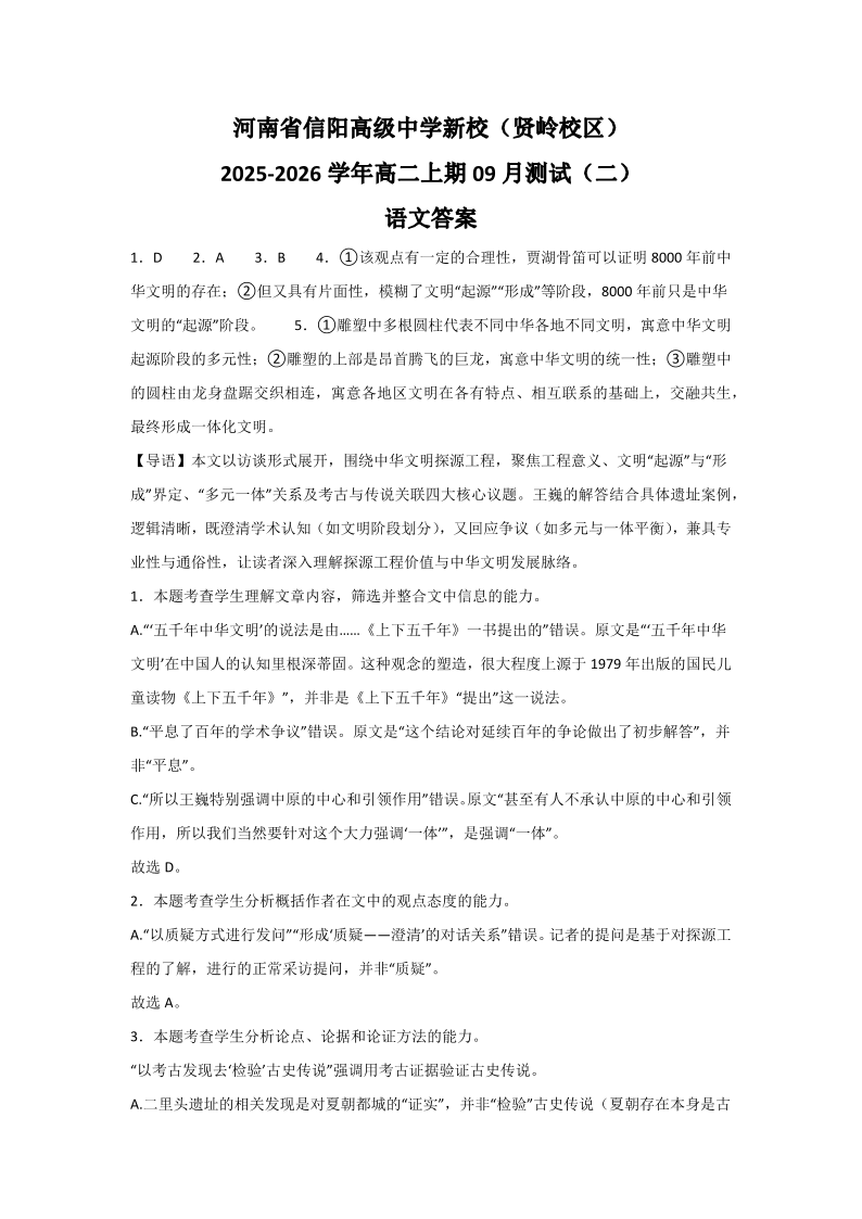 高二语文答案--河南省信阳市浉河区信阳高级中学2025-2026学年高二上学期9月月考