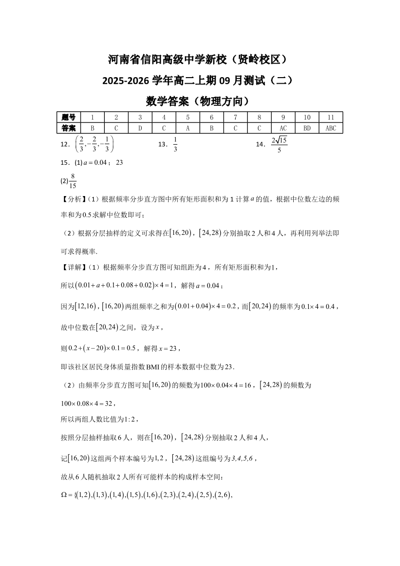 高二数学答案--河南省信阳市浉河区信阳高级中学2025-2026学年高二上学期9月月考