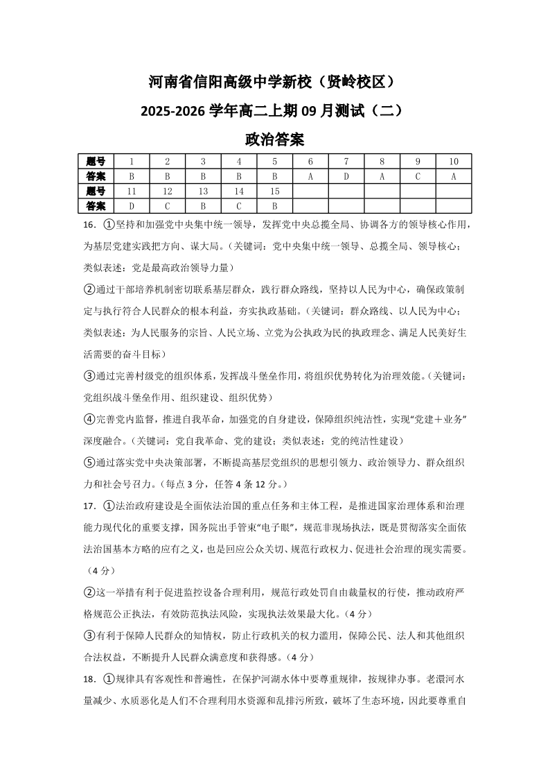 高二政治答案--河南省信阳市浉河区信阳高级中学2025-2026学年高二上学期9月月考