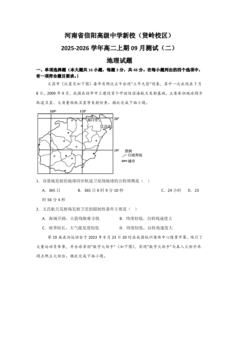 高二地理--河南省信阳市浉河区信阳高级中学2025-2026学年高二上学期9月月考