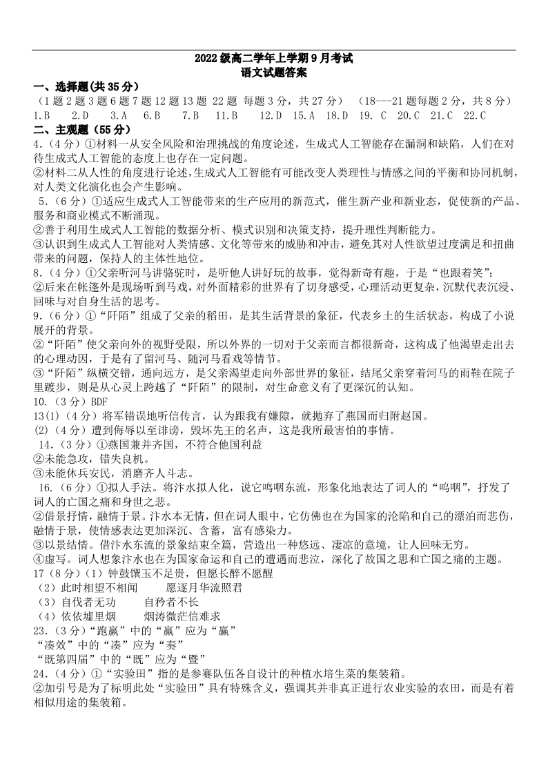 高二语文答案--黑龙江省牡丹江市第一高级中学2025-2026学年高二上学期9月月考