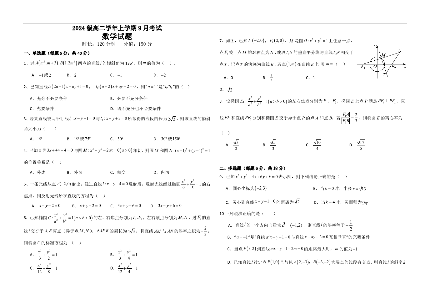 高二数学(平行班)--黑龙江省牡丹江市第一高级中学2025-2026学年高二上学期9月月考