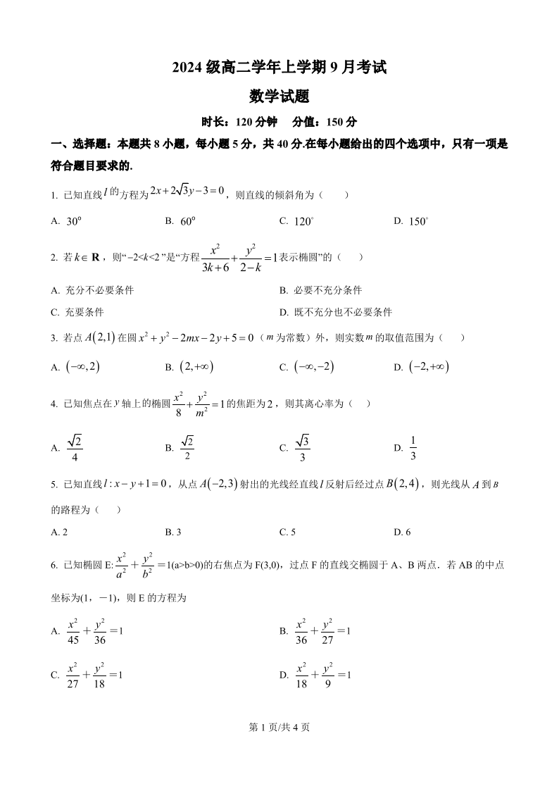 高二数学(致远班)(原卷版)--黑龙江省牡丹江市第一高级中学2025-2026学年高二上学期9月月考